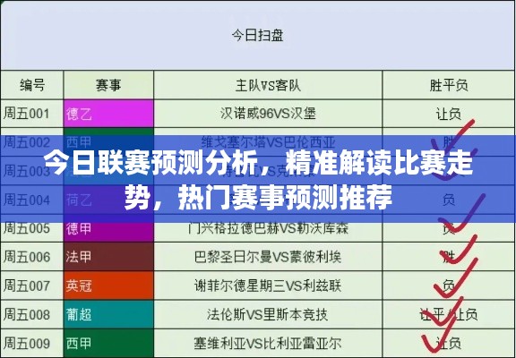 今日的联赛赛事中,各支球队都有机会取得胜利,除了球队实力对比,球员状态、主场优势、历史交锋记录等因素都将对比赛结果产生影响,在进行预测时,我们需要综合考虑多个因素。